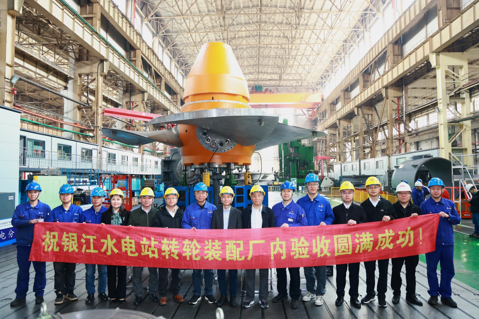 轉輪是水力發電機組的核心部件之一。銀江水電站安裝有6臺單機容量為6.5萬千瓦的水輪發電機組,所采用的轉輪具有設計難度大、制造難度高等特點。為確保銀江水電站的工程建設進度,27日當天,在哈電集團哈爾濱電機廠內,驗收組依據設計圖紙、技術規范及行業標準,對轉輪本體尺寸精度、焊縫質量、動平衡試驗數據、槳葉預裝配合度等12項核心技術指標進行了現場實測與資料復核。經多維度綜合評定,轉輪裝配各項技術參數均符合設計規范要求,設備制造質量達到優良標準,交貨進度滿足項目節點計劃,順利完成驗收。