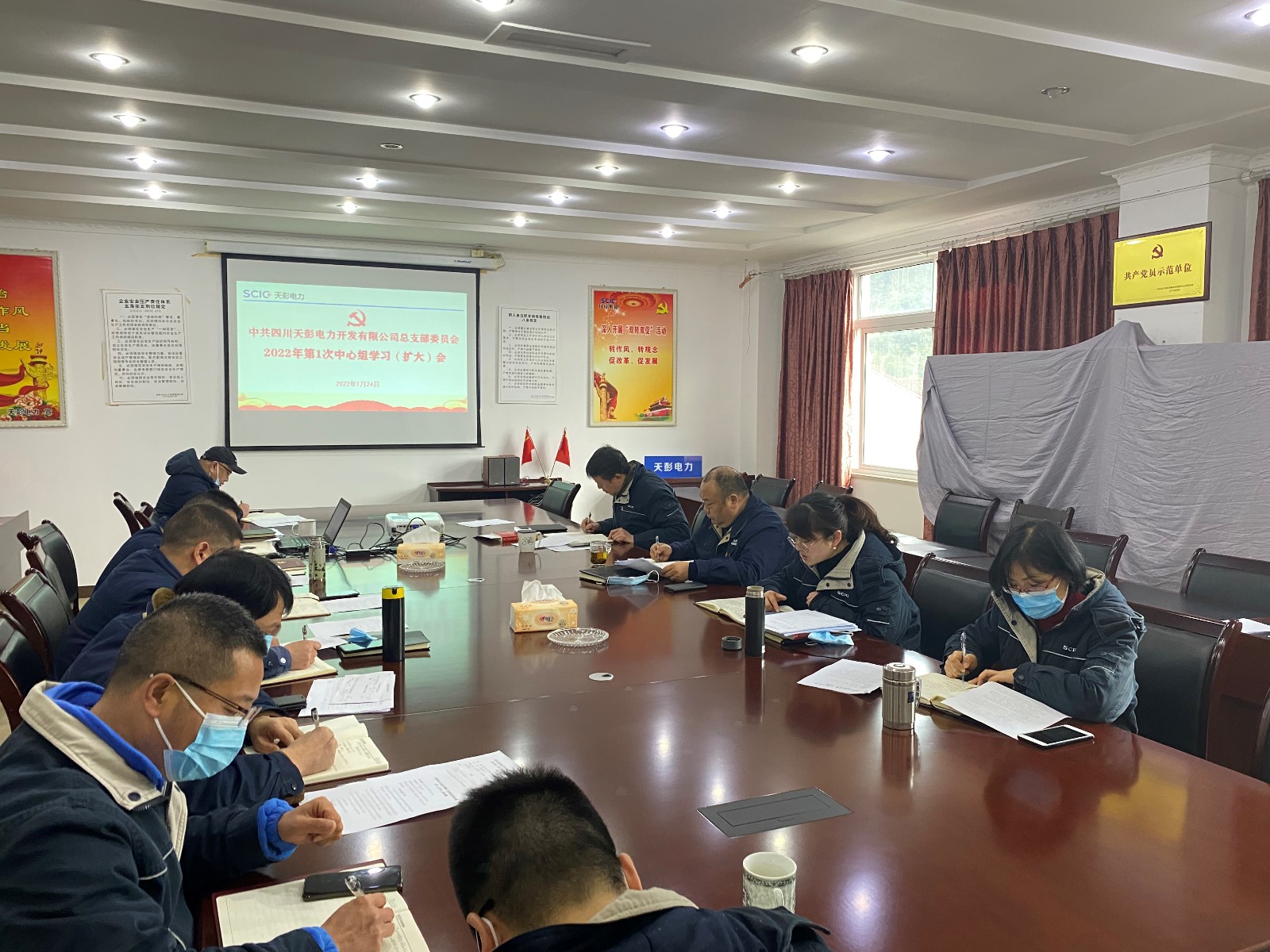 1月24日上午,天彭電力黨總支在公司二樓會議室召開2022年第1次中心組學習(擴大)會,公司領導、黨員干部、關鍵崗位人員參加會議,會議由公司黨總支書記、董事長、總經理陳忠主持。