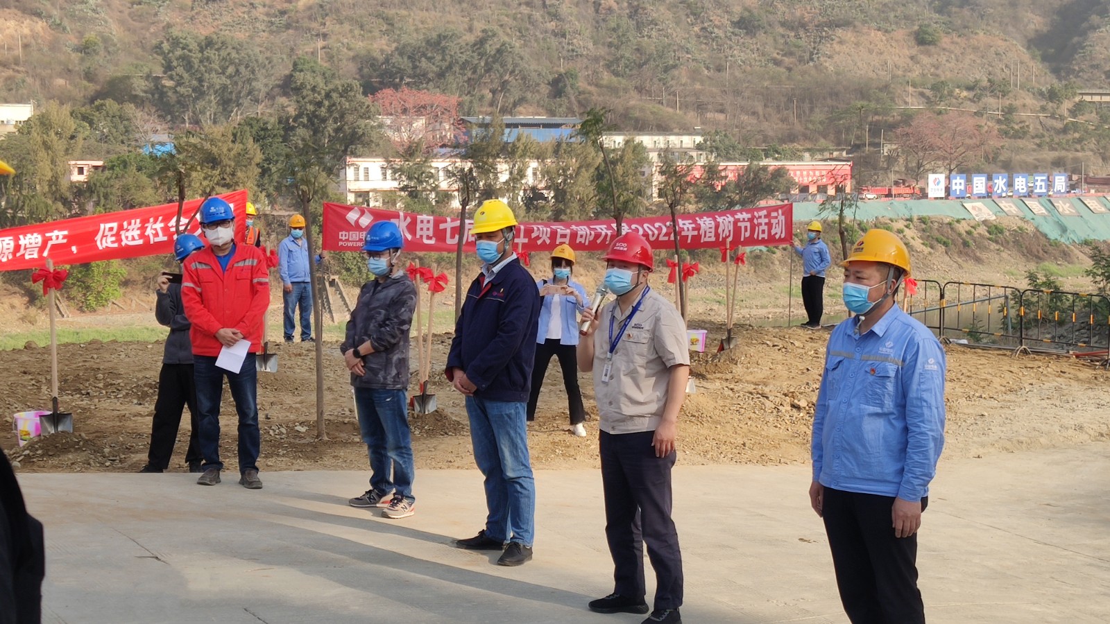 陽春三月,萬物復蘇。3月12日,適逢一年一度植樹節,銀江水電站各參建單位在金沙江邊、工程施工現場空曠區域聯合開展了“3.12”植樹節活動。活動由攀水電公司牽頭,華東院環水保監理組織,水電五局、水電七局聯合承辦,各參建單位共同參與。攀水電公司黨總支委員、總經理吳巍嶼,黨總支委員、董事會秘書、工會主席鄧勇與各參建單位項目主要負責人、員工代表共同種下了一顆顆象征團結友誼和綠色環保的同心樹。