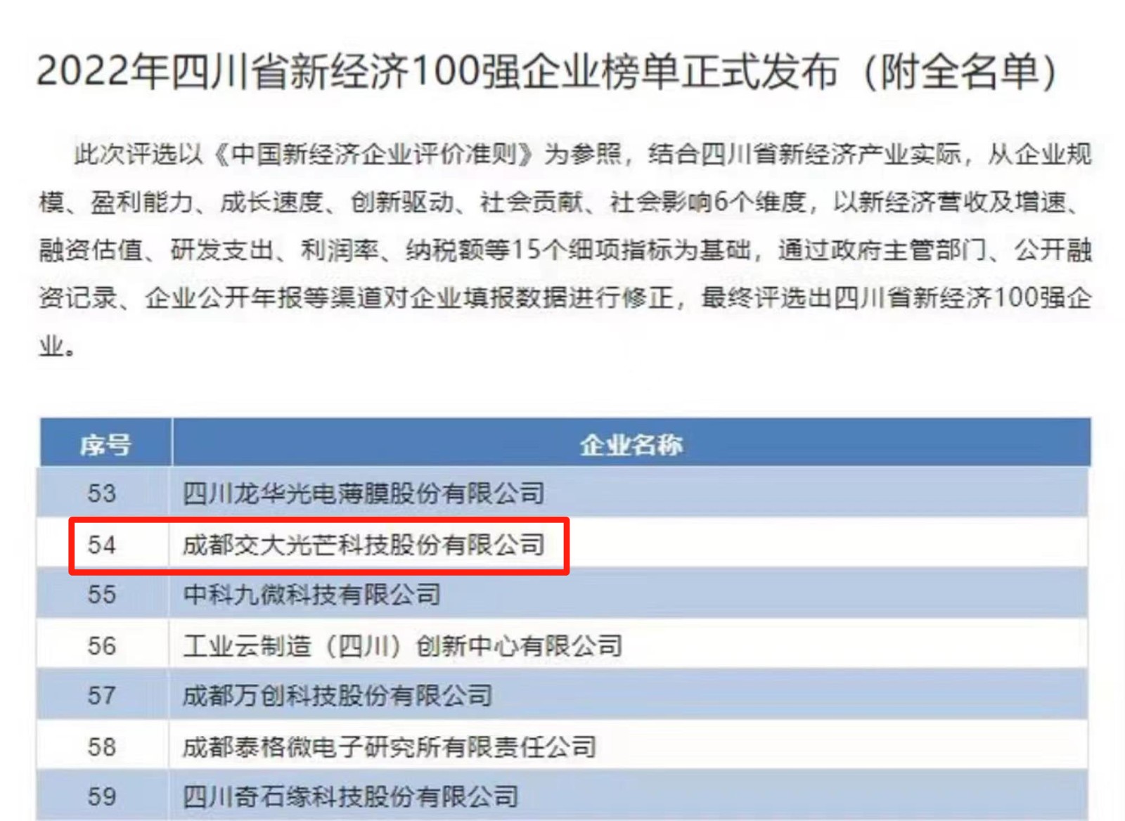 近日,四川省工業(yè)和信息化研究院發(fā)布“2022年四川省新經(jīng)濟(jì)100強(qiáng)企業(yè)榜單”,交大光芒成功獲評(píng)入圍,標(biāo)志其位居四川省以新技術(shù)、新產(chǎn)業(yè)、新業(yè)態(tài)、新模式為特征的新經(jīng)濟(jì)企業(yè)的前列。