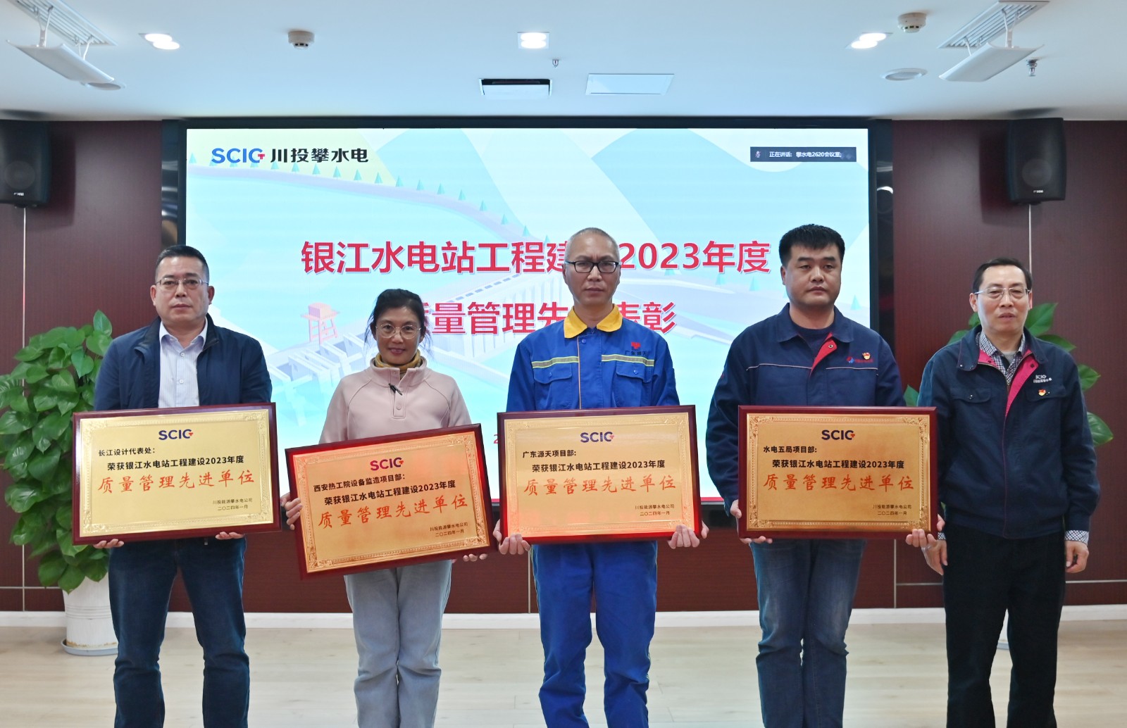 會上,公司副總經理唐伽宣讀了《關于表彰銀江水電站2023年度質量管理先進單位、先進集體和先進個人的通報》文件,徐孝剛向榮獲2023年度質量管理先進單位的長江設計代表處、西安熱工院設備監(jiān)造項目部、水電五局項目部、廣東源天項目部頒發(fā)了獎牌;公司黨總支副書記、董事會秘書、工會主席鄧勇,公司黨總支委員、紀檢小組長楊銳向榮獲先進集體的長江設計代表處壩工專業(yè)組、貴陽院監(jiān)理部土建工程管理部、西安熱工院設備監(jiān)造項目部駐哈電監(jiān)造站、水電七局項目部砂石工區(qū)、水電五局項目部土建三隊、廣東源天項目部主機班等13個集體頒發(fā)了獎牌。徐孝剛向獲獎的單位、集體及個人表示了祝賀,要求他們在今后的質量管理工作中發(fā)揮好先鋒模范帶頭作用,促進各參建單位共同提高質量管理水平,把銀江水電站建設成“精品工程、樣板工程、陽光工程”。