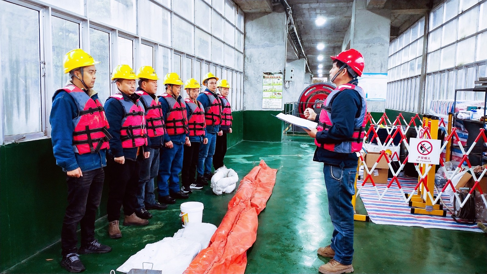 演練以局部湖面水質污染為背景,采用現(xiàn)場模擬形式進行。上午9:30分,鳳鳴湖大壩1#、2#、3#弧形閘門全關,進水閘門全開,大壩引水隧道正常通水,鳳鳴橋站單機運行,當值運行人員巡視檢查中發(fā)現(xiàn)庫區(qū)湖面局部污染,按公司《突發(fā)環(huán)境事件應急預案》,“險情”于第一時間傳達至當值班長、車間主任和公司應急領導小組,同時車間迅速啟動防水環(huán)境污染事件應急預案,各項應急處置流程迅即有序進行,沙金車間封堵控制滲漏源,鳳鳴橋車間立即停機關閉蝶閥,搶險人員緊急使用攔油索、吸油棉及工器具阻擊水面油污擴散,經(jīng)過各方爭分奪秒通力配合,湖面滲漏油全部打撈處置完畢,成功處置了這起“突發(fā)水環(huán)境污染事件”。