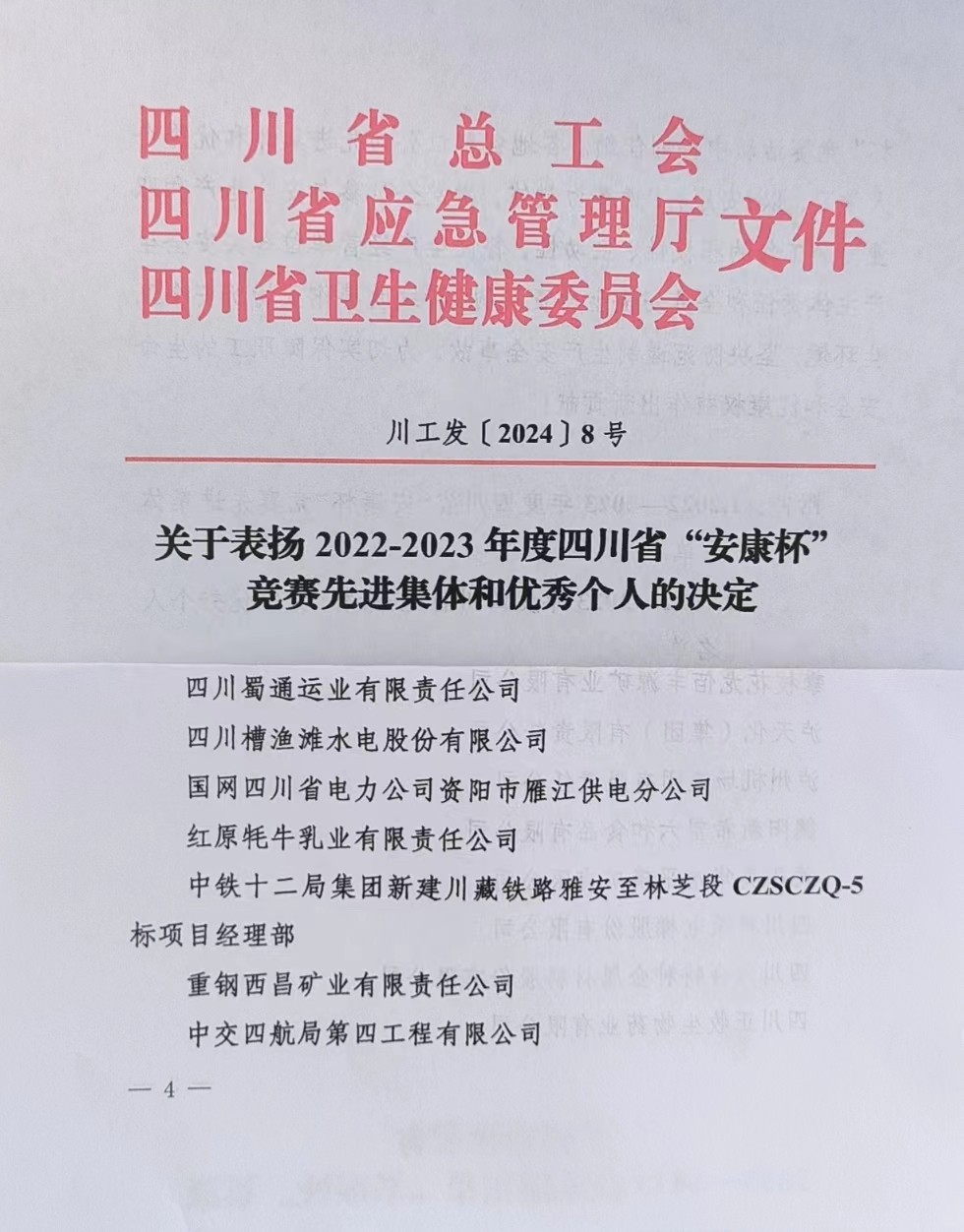 近日,四川省總工會、四川省應急管理廳、四川省衛生健康委員會聯合印發《關于表彰2022-2023年度四川省“安康杯”競賽先進集體和優秀個人的決定》,四川槽漁灘水電股份有限公司(簡稱“槽漁灘公司”)榮獲四川省“安康杯”競賽優勝單位榮譽稱號。