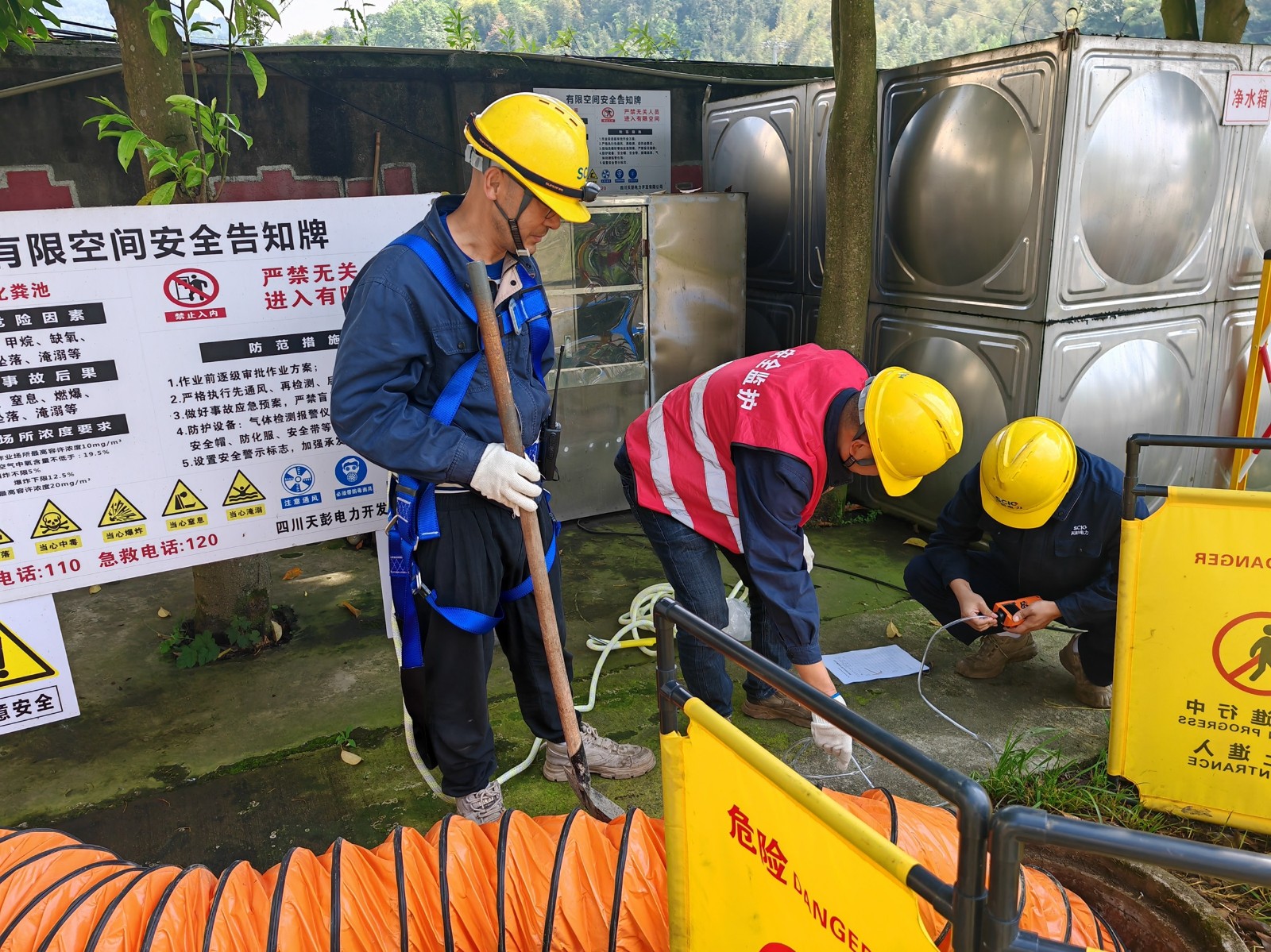 隨后,在公司辦公樓側化糞池場地開展了有限空間作業及中毒窒息事故現場處置實戰演練。首先明確各組人員分工、職責及工作流程,并做好物資清點和自檢互檢,作業過程嚴格按照“先通風、再檢測、后作業”的原則,每一步都井然有序進行。演練模擬作業人員缺氧窒息“險情”,迅速啟動應急救援預案并實施救援程序。各組人員按職責分工配合、高效運轉,救援人員嚴格配備正壓式空氣呼吸器、安全帶等防護措施,正確使用應急救援設備,在監護人員的安全監護下,沉著應對、科學施救,成功完成了對“傷者”的及時轉移和緊急救護。