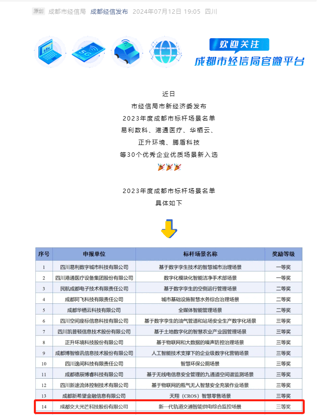 近日,成都市經(jīng)信局市新經(jīng)濟(jì)委發(fā)布2023年度成都市標(biāo)桿場景名單,交大光芒新一代軌道交通智能供電綜合監(jiān)控場景榮獲三等獎。