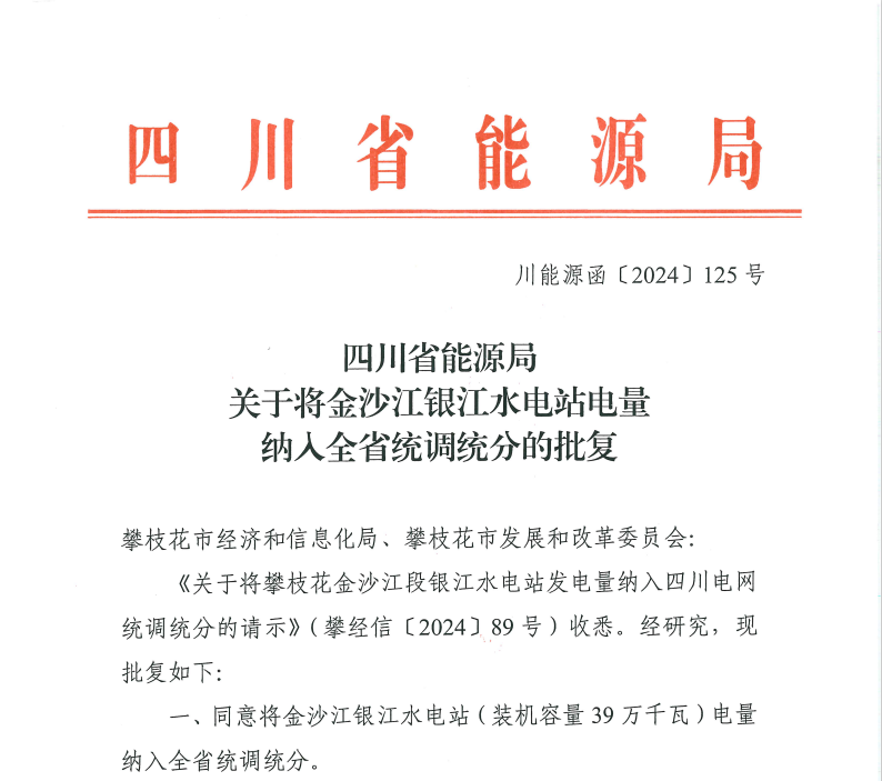 8月27日,在四川省能源局、攀枝花市有關(guān)部門和川投能源的指導(dǎo)幫助下,經(jīng)過積極對(duì)接、多方協(xié)調(diào),攀水電公司成功取得四川省能源局將銀江水電站電量納入全省統(tǒng)調(diào)統(tǒng)分的批復(fù),為實(shí)現(xiàn)銀江水電站2024年首臺(tái)機(jī)組投產(chǎn)發(fā)電目標(biāo)再增“助推器”。