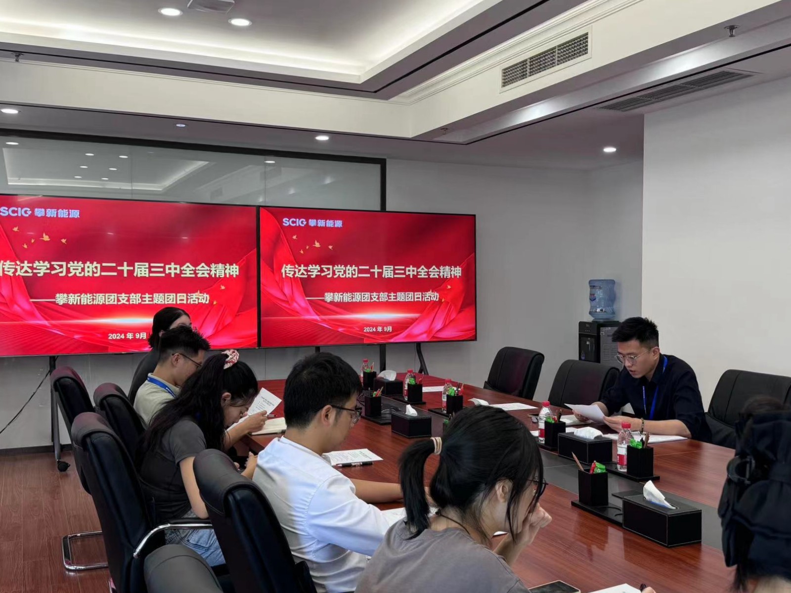 近日,攀新能源公司團支部在川投大廈707會議室舉行2024年9月主題團日活動,專題傳達學習《中國共產黨第二十屆中央委員會第三次全體會議公報》,學習貫徹黨的二十屆三中全會精神。攀新能源團支部書記、經營管理部經理潘鑫主持并領學,公司全體團員及屏山抽蓄公司全體團員參會。