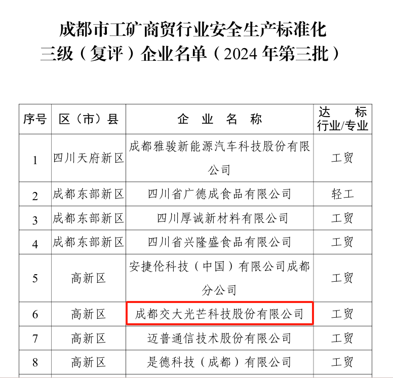 2024年9月,成都市應急局發布《關于公布成都市工礦商貿行業安全生產標準化三級(復評)企業名單(2024年第三批)的通知》,交大光芒通過安全生產標準化三級達標復評。