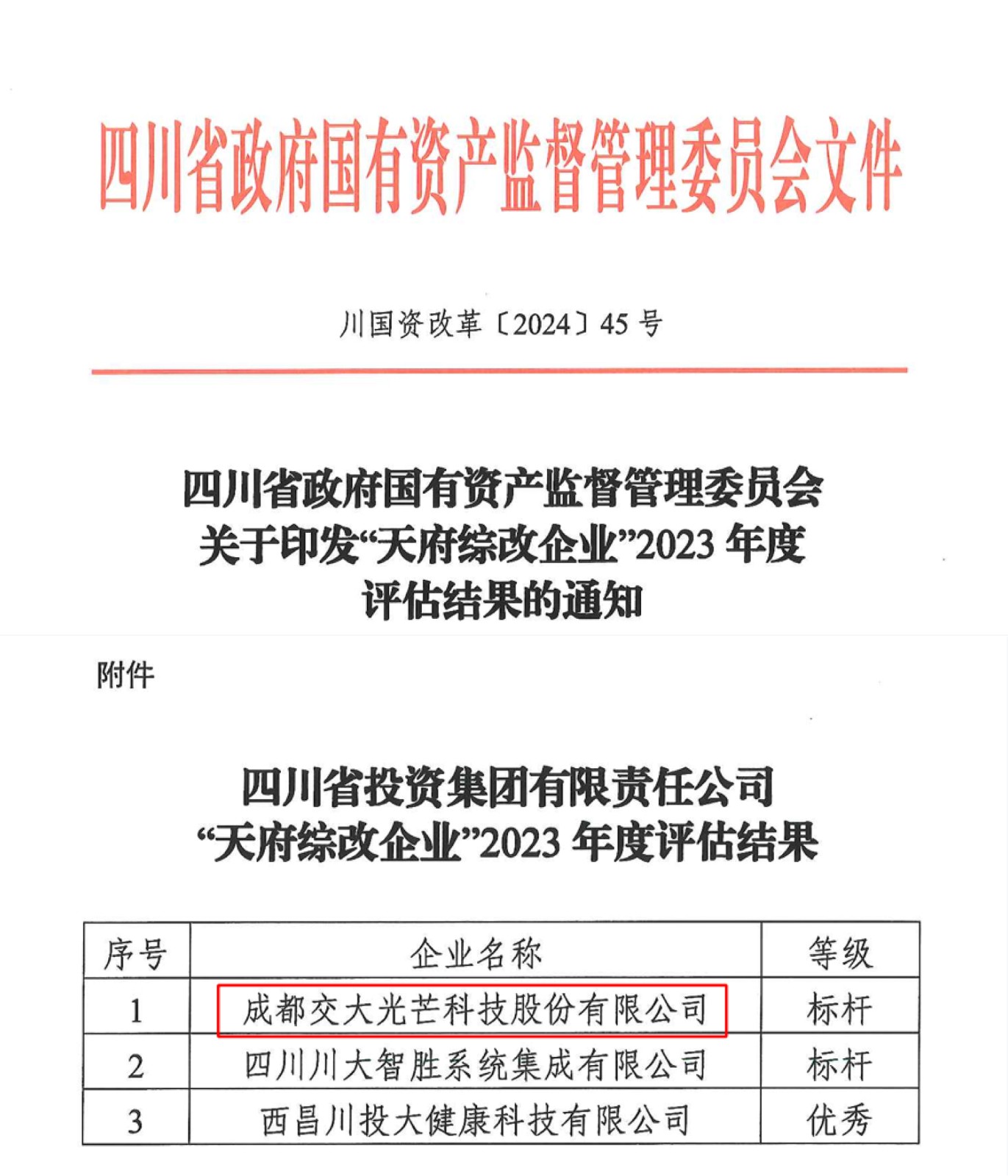 近日,四川省國資委印發(fā)“天府綜改企業(yè)”2023年度評估結果,交大光芒被評為A級(標桿)。此次評估由省國資委聘請獨立第三方機構進行,97戶“天府綜改企業(yè)”中被評為A級(標桿)的共22戶。