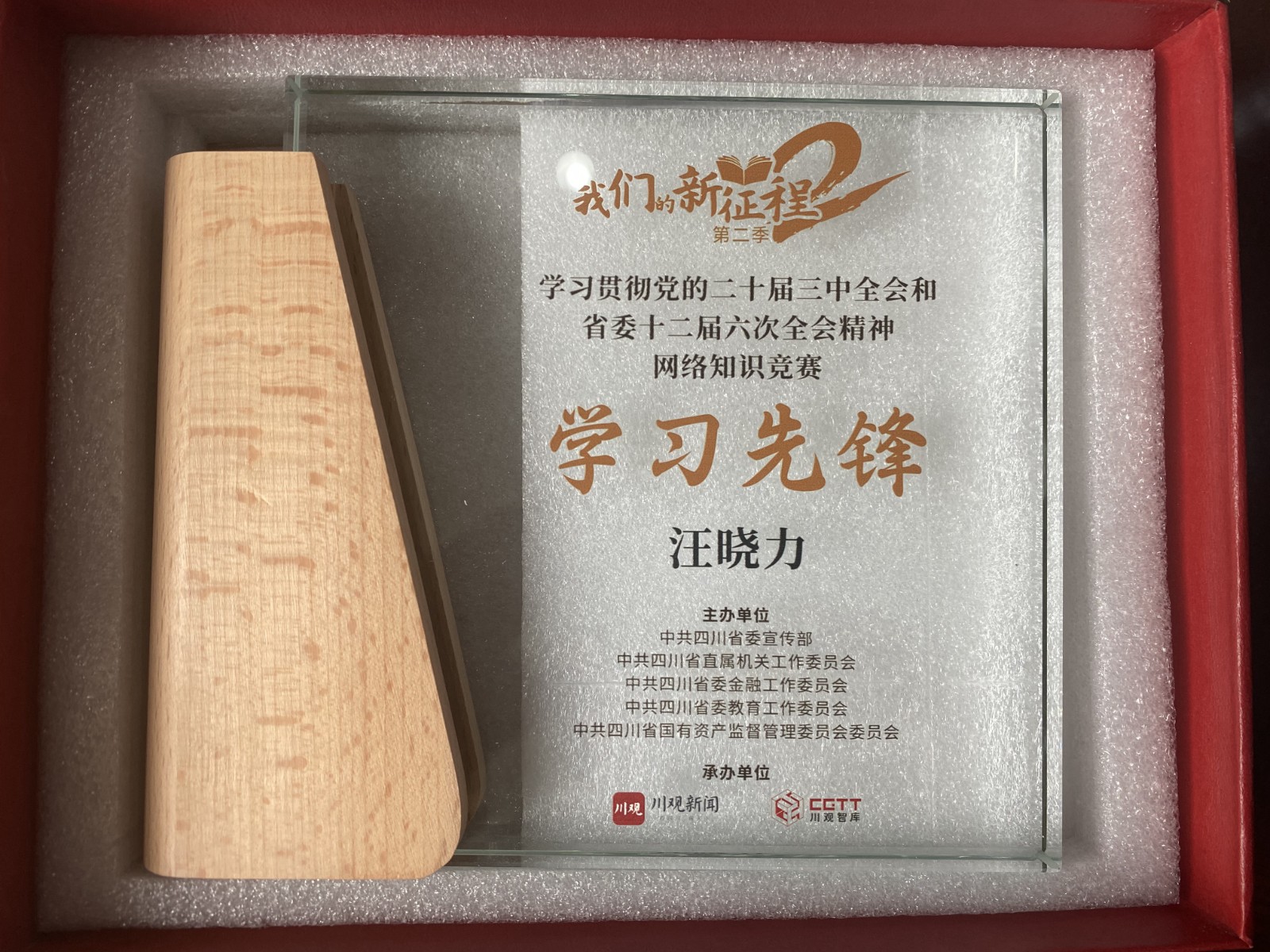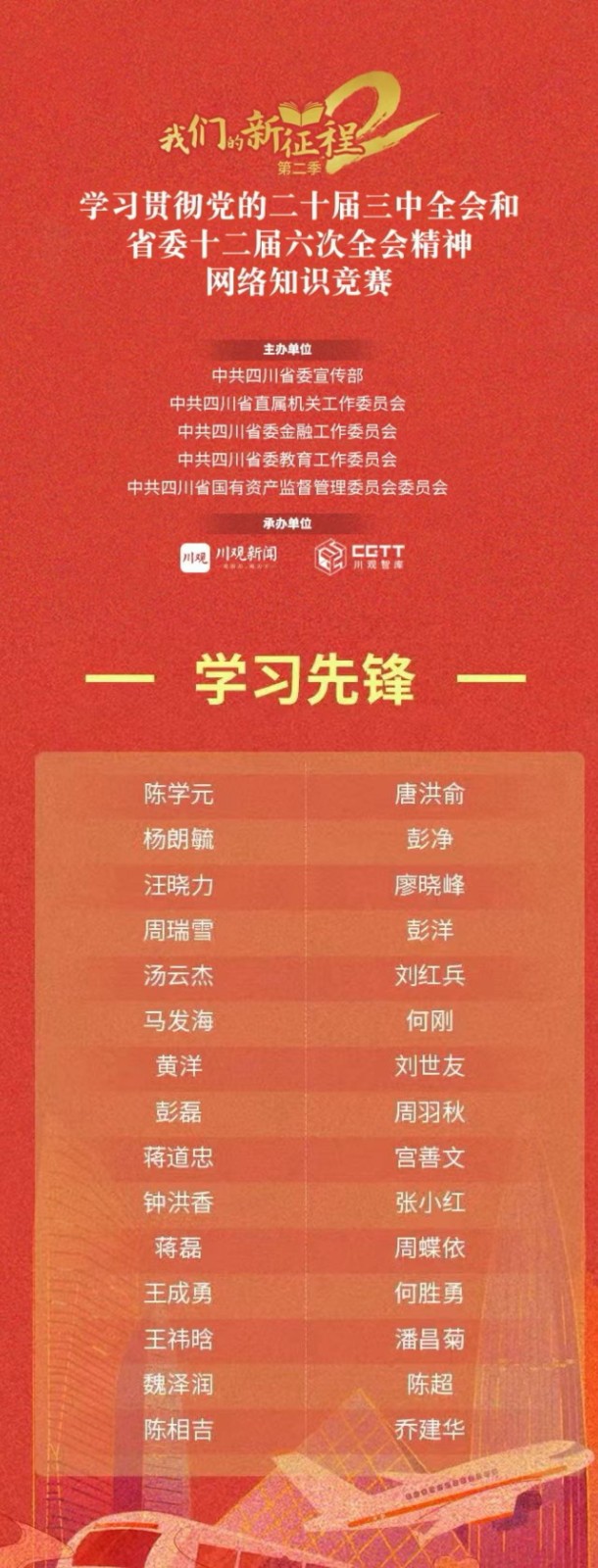 近日,由中共四川省委宣傳部、省委省直機關工委、省委金融工委、省委教育工委、省國資委黨委聯合主辦,四川日報報業集團承辦的“我們的新征程”(第二季)網絡知識競賽公布了獲獎名單,并為獲獎人員發放獎牌,川投電力所屬天彭電力11名員工憑借扎實的理論功底和鍥而不舍的努力,從全省32萬余名參與競賽的黨員群眾中脫穎而出,進入全省個人排行榜前30名,榮獲“學習先鋒”稱號。