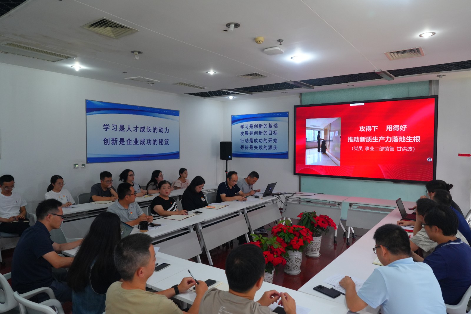在研討分享環節,各支部派出代表結合自身崗位特點分享交流實踐經驗。第一黨支部研發人員以技術文檔寫作為切入點,為大家提高技術寫作水平提供了寶貴經驗。第二黨支部結合業務工作中分享費用報銷中容易出現的相關問題,并強調要將合規守法貫穿工作始終,杜絕僥幸心理,嚴守黨員本色。第三黨支部分享銷售人員甘洪波的事跡,鼓勵大家以黨的創新理論為指引,在工作中沖鋒在前,不斷推動新質生產力落地生根,在工作中彰顯黨員先鋒本色。