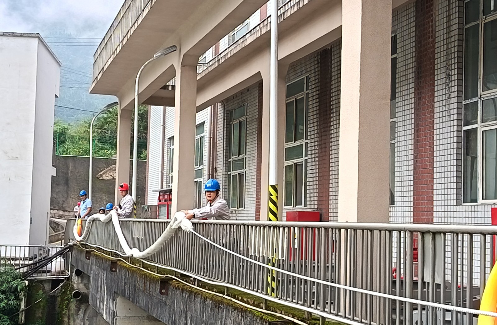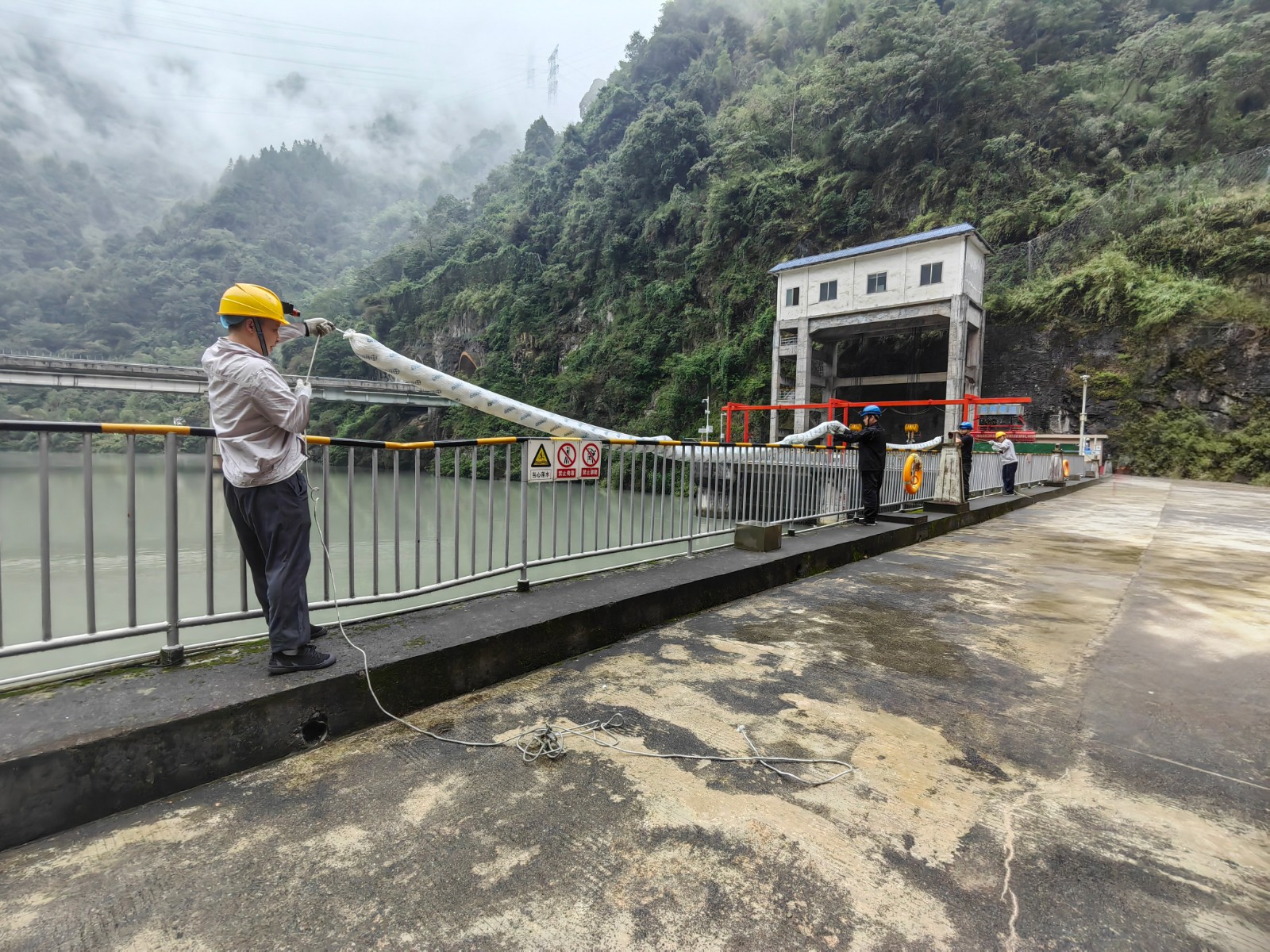 本次演練背景設定為電站大壩2#泄洪閘左側齒輪箱突發漏油,約50升齒輪油濺落至庫區水面并擴散,值班人員發現險情后立即啟動應急響應。中控室迅速協調上下游鍋浪蹺、匯溪電廠調整出力流量并協助布設攔油設施;運行組與應急搶險組攜帶吸油氈、攔油索等器材趕赴現場,對漏油點進行封堵,同時在閘門前和水面關鍵區域鋪設攔油繩,防止污染擴散;后勤保障組全程待命,確保物資供應和人員安全。經過30分鐘緊張有序的處置,油污被徹底清理,庫區水質未受影響,演練圓滿完成。