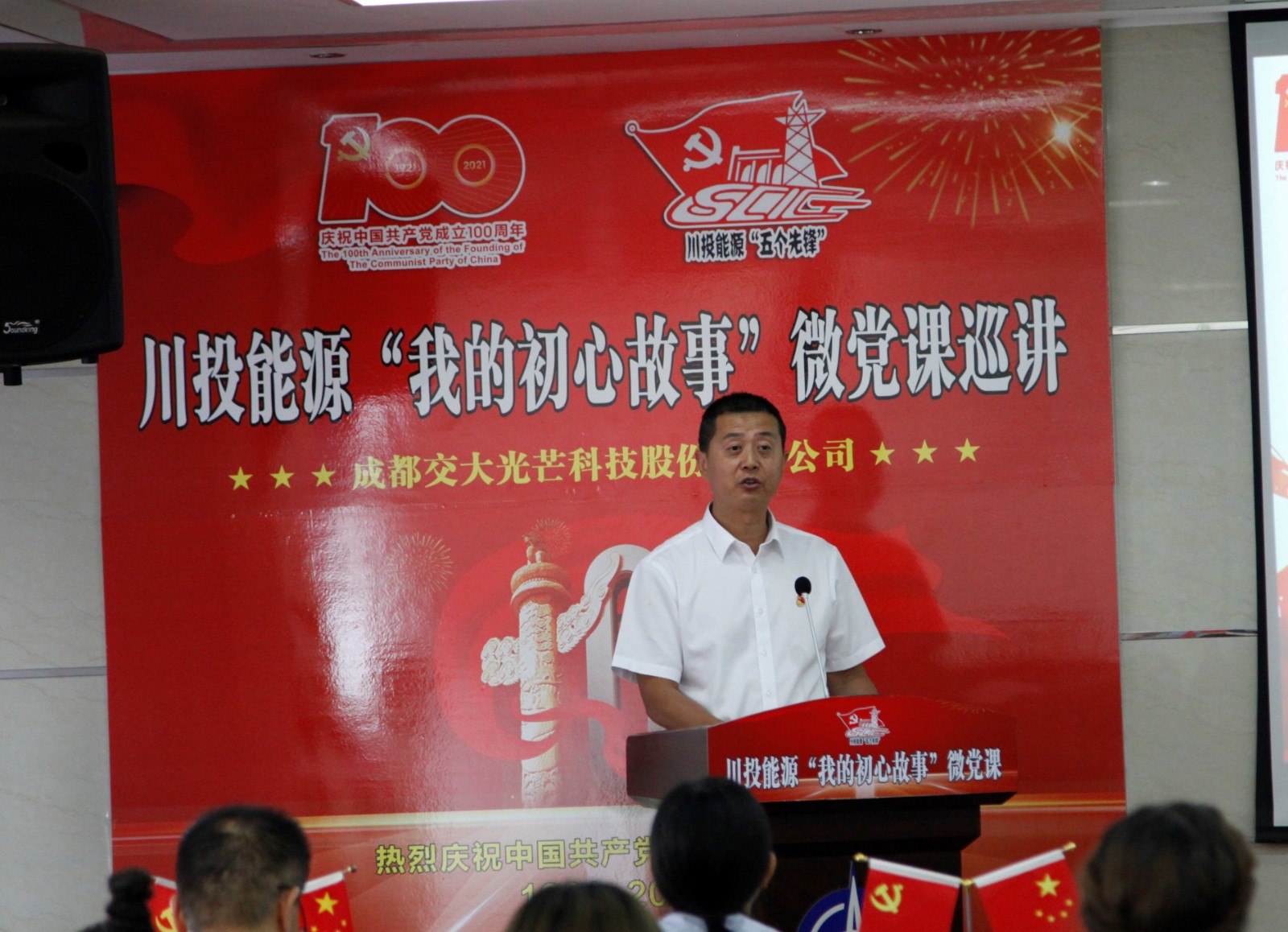 在全黨深入開展黨史學習教育之際,5月25日,川投能源“我的初心故事”微黨課巡講團走進交大光芒。微黨課巡講團由能源本部、天彭電力、槽漁灘公司、交大光芒、川投電力和攀水電公司選派的6名優秀黨員代表組成。川投能源黨委副書記、工會主席楊超龍,交大光芒黨總支書記、總經理劉成輝和交大光芒黨員、員工代表30余人參加本次活動。